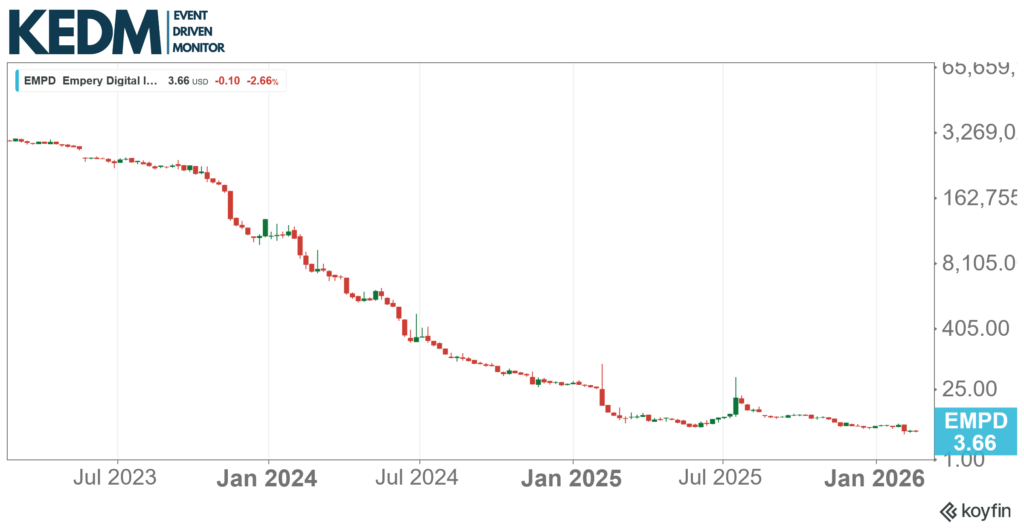 Empery Digital (EMPD) is a typical case of what’s going on today. Reverse merger into a BTC treasury company in 2025, holding over 4k BTC, carrying value of roughly $270m, which is now dropping like crazy given BTC declines, borrowed against BTC to buy back shares ‘below NAV’, is now in panic mode, activists are popping up, etc.