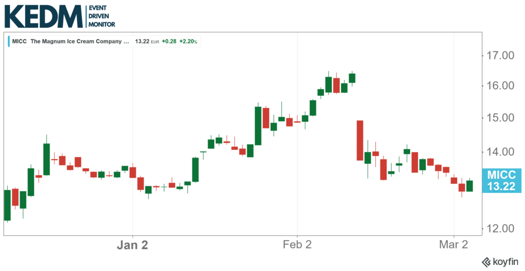 Spin-off Monitor: The Magnum Ice Cream company (MICC NA) spun out of Unilever in December, grew by +25% in a few months, and has dropped back over the past few weeks, already missing earnings. And while certainly not a Fallen Angel in our book, we think there’s a good chance this one might make that list in the future.