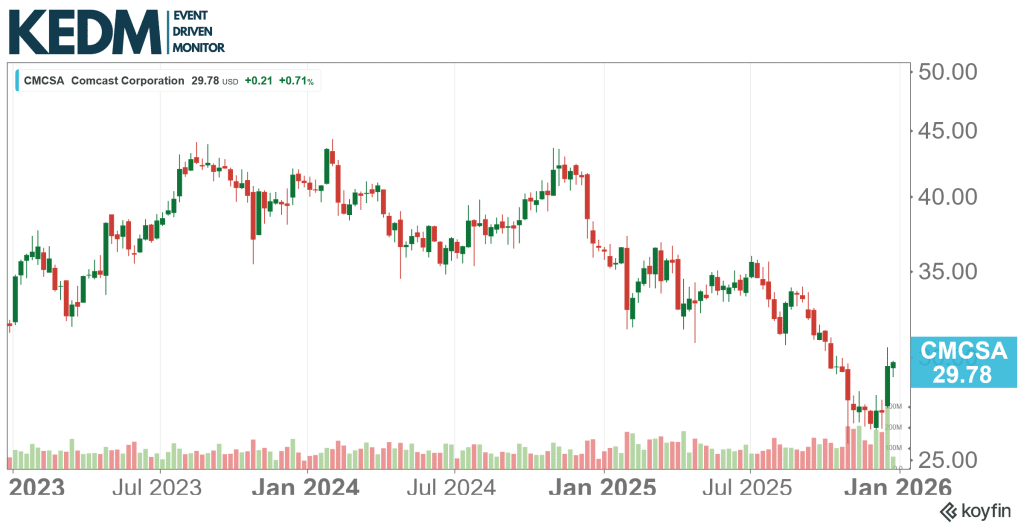 Announced Spin-off Monitor: Comcast’s (CMCSA), spin-off Versant (VSNT), starting when-issued trading this week, closing at $47/share (albeit on low volume). This translates to a ~$6.8bn market cap and ~$9bn enterprise value for VSNT.