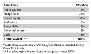 Max allocated to PE with no flexibility on cash flow distributions to the university. Princeton and Yale are the same. Stanford is a bit better (21% of the university budget).