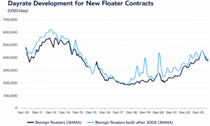 Figure: Day Rates (USD / day) over the last 15 years. There has been a noticeable step down since the peak in late 2024.