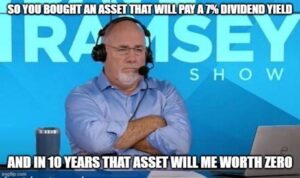 And then magically, the proposition became a 7% dividend yield with 5% growth on top. Shares would rise to reflect this new reality, and more expensive shares would accelerate this reflexive process further.