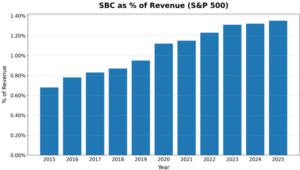 While this trick is as old as time, the SBC-to-revenue ratio has grown significantly. Part of this might be attributed to the increased weight of tech companies in the S&P500, but once companies realized this glitch in the Matrix, it only made sense that they started taking advantage of it.