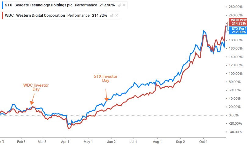 In other words, execution risk was low: the transformation had already happened. In addition, both STX and WDC explained that the industry had consolidated, that AI was driving demand for HDD storage, and that neither was planning to add new supply. There was a macro tailwind. Both companies continued to perform strongly, and in hindsight, the investor day was indicative of an inflection.