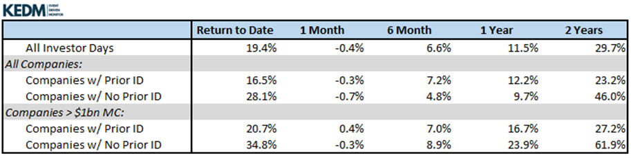 If we exclude small caps with a market cap of <$1b from our sample, there is a considerable performance difference between companies with a first-ever investor day and the regular presenters.