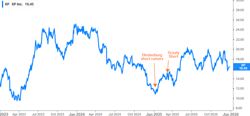 In 2025, 2 names discussed in our KEDM thematics got hit by a short report. The Brazilian stockbroker XP was written up by Grizzly Research, who alleged that XP’s profits are largely derived from 2 internal funds, accounted for as Variable Interest Entities, with improbable Ponzi-like returns. XP’s defense is that, while its market-making business is structured as a fund for tax reasons, it is really an operating business, which explains the steady returns. So far, XP seems to be correct, and the day of the publication of the short thesis ended up being the bottom in XP’s share price. The short report presented a buying opportunity for those who could quickly verify the short seller’s claims.