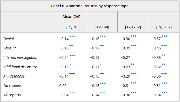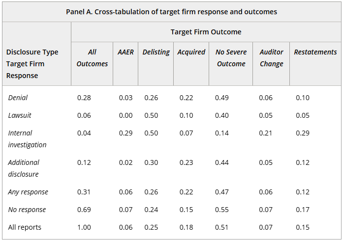 A 2021 study by Brendel & Ryans examined 351 short seller reports from 25 short sellers from 1996 to 2018. In their study, 31% of the targets responded to the allegations. 28% of targeted companies would deny the allegations, and 12% would provide additional disclosure. Those firms did relatively well, with 49% and 44% showing no severe outcomes, respectively.